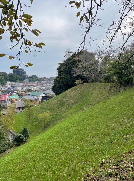 土橋の幅を狭くすることで、一度に多勢の敵が渡れなくしていました。さらに、曲がった坂をつけて敵の進む速度を低下させ、北にあるⅠ郭の土塁上から側面攻撃を受けやすくなるように工夫されています。